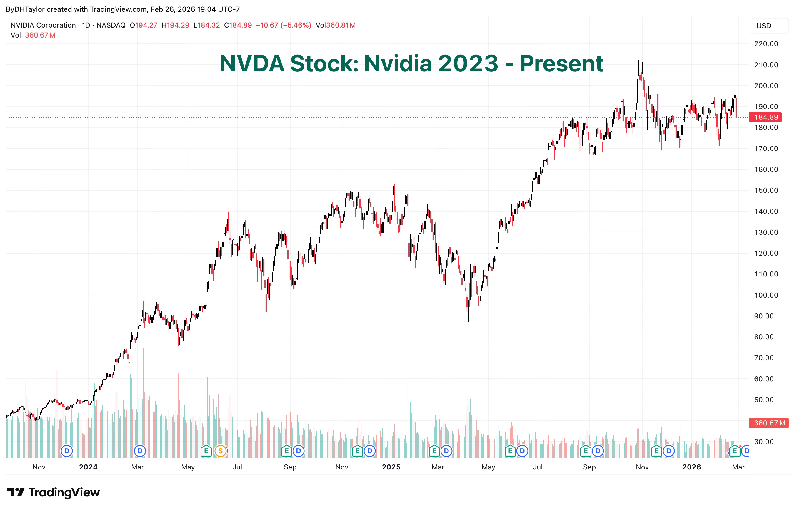 The chart above shows where the “AI Trade” has moved, and where it is at the moment. In 2023, OpenAI announced its conversational search engine. Because Nvidia’s chips power the lion’s share of the AI foundation, during the following two years, NVDA stock moved from ~$40 in 2023 to over $200 in 2025.