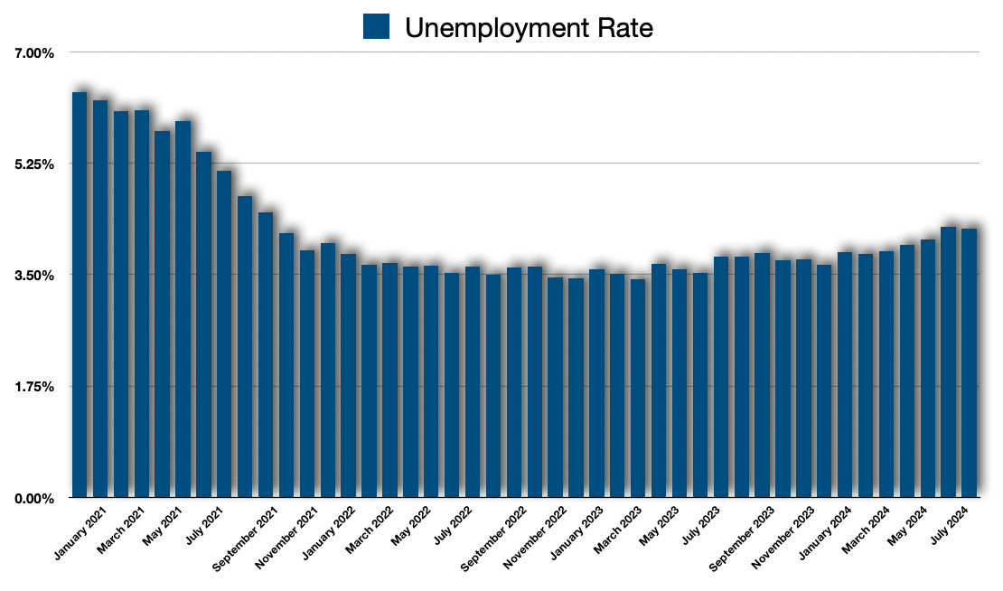 While the unemployment rate has moved somewhat higher over the past 4-6 months, the move upward has started from a near-record low. Unemployment is only printing 4.2% for the month of August. This is historically strong with regard to employment–the economy is a long way away from being in a downward spiral.
