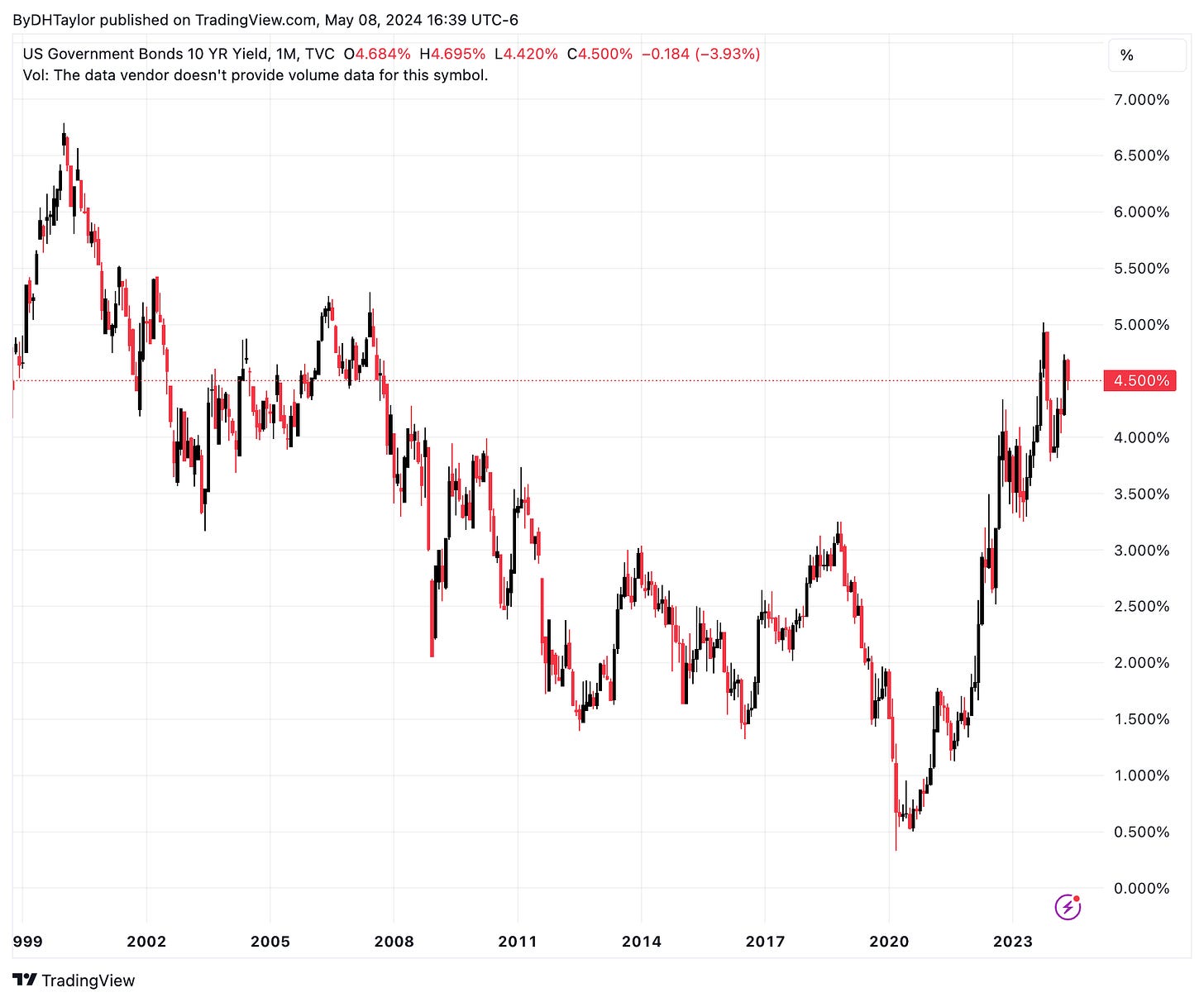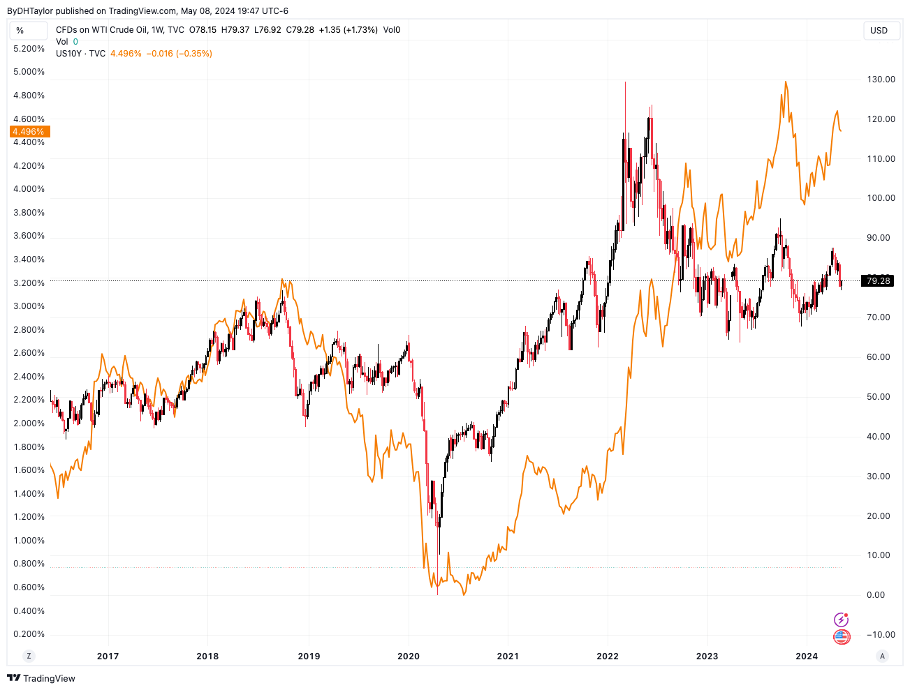Above, I am comparing WTI - or the price of oil, versus the US 10 Year Treasury yield. There are obvious ebbs and flows with interest rates and the economy overall when you look at both of these.