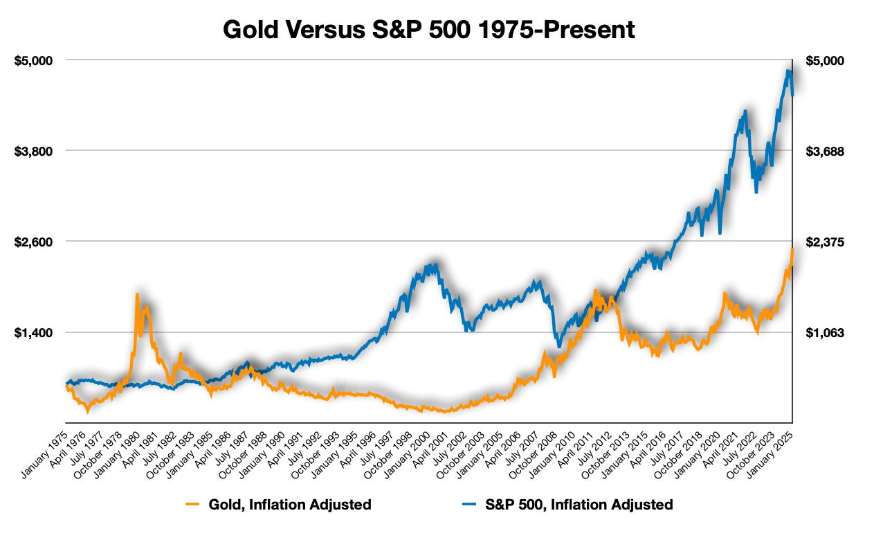 When you inflation-adjust both the price of gold and the S&P 500 all the way back to the Nixon Shock, you see that largely gold has remained relatively benign in price gains.