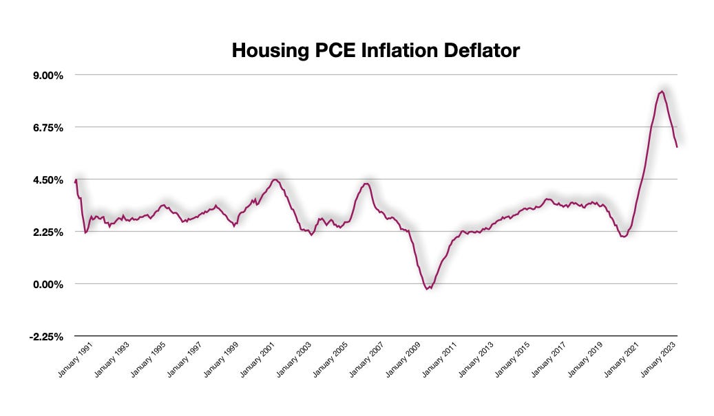 Beyond these numbers, the real focus remains what drove inflation upward like it did, accounting for ~70% of the latest inflation gains: housing. The housing portion of the PCE is still lofty and remains well above the 2.00% overall target at a massive 5.85%.