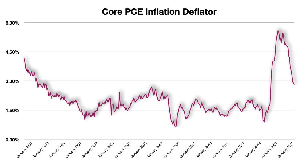 The one thing that I noted was the month-over-month change in the core PCE Price Index, and that was about 0.261% month-over-month increase. Multiply that by 12 and you get a number annualized at about 3.13%. That is simple math and does not take in to affect compounding, which would increase the rate to a number closer to 4.00%, if not higher.