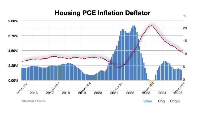 The above chart is the Case-Shiller Housing Price Index (Blue bars) along with the rate of change, the year-over-year growth rate in housing prices from the PCE Price Index, the housing portion.
