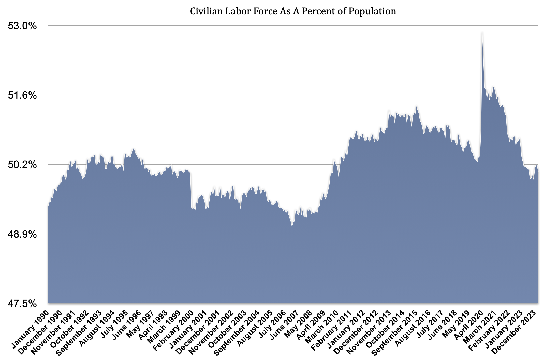 As a percentage of the total population, the Civilian Labor Force is fairly neutral with regard to how many individuals within the US population the Bureau of Labor Statistics feels wants a job. The fact that unemployment is low has not necessarily drawn in new individuals into the labor force despite price pressures forcing families to shift lifestyles in order to make ends meet. I felt this was an interesting chart to put together. I would have assumed that the on a percentage basis, and considering the low unemployment level, the civilian labor force would have been higher. It is not: It is moving lower.