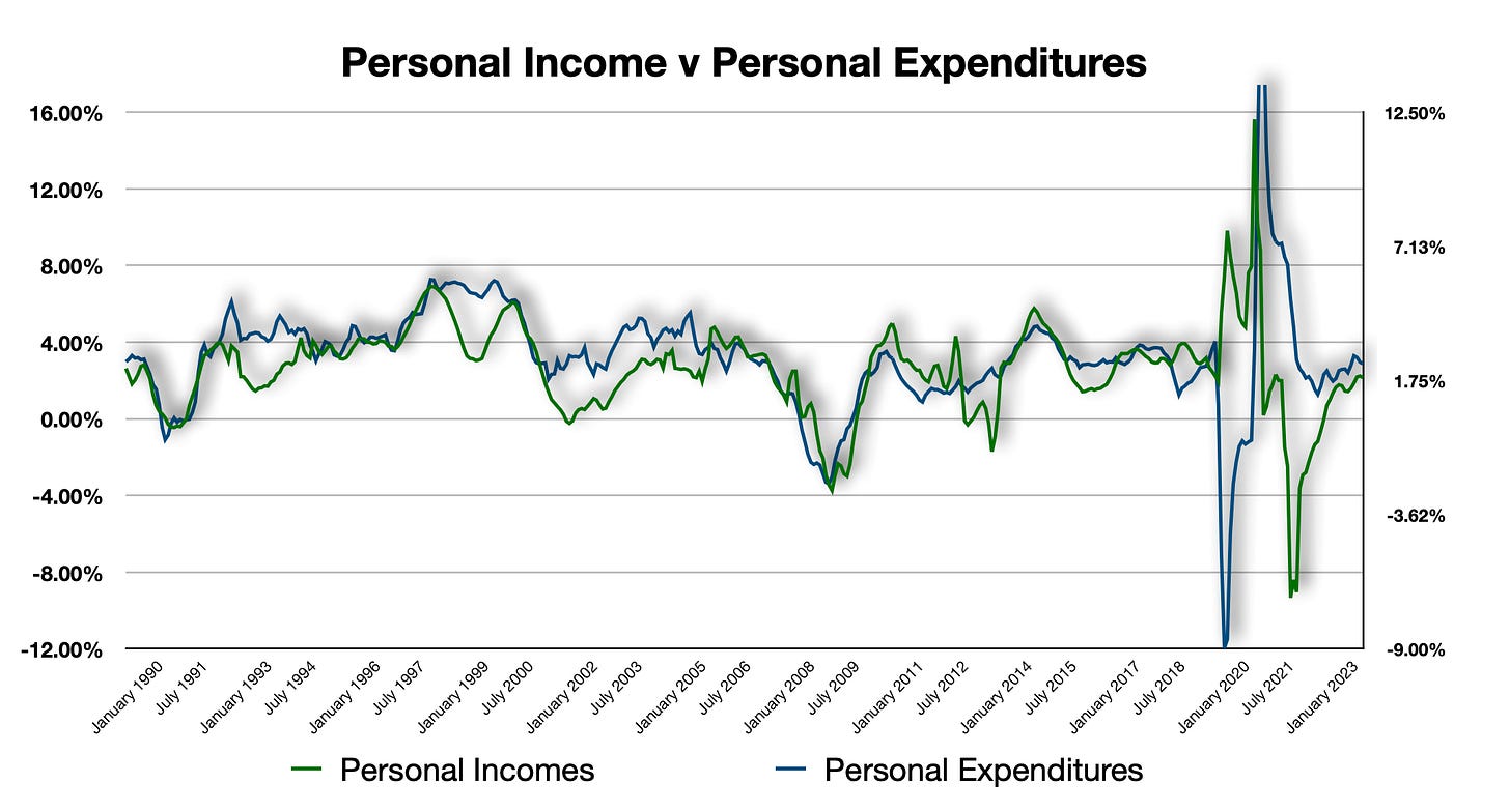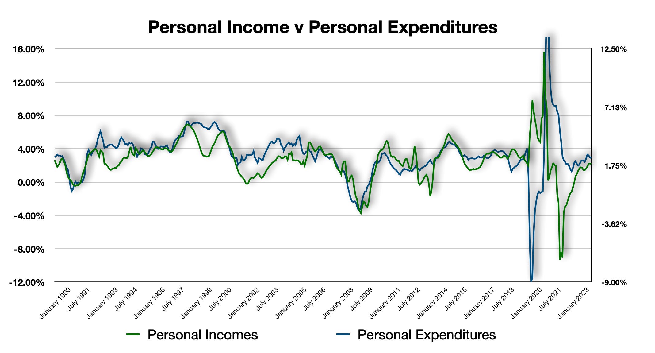 At the same time, income growth has leveled out recently. The stimulus checks are all cashed and spent, and the Biden Inflation Reduction Act has pushed the economy as significantly as it can for now - any further gains are going to be incremental.