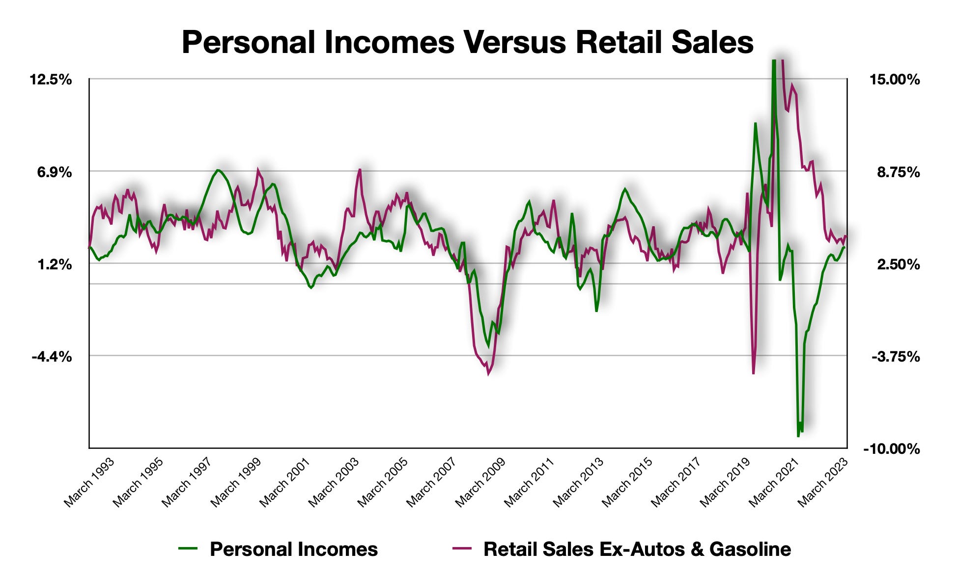 Above, you can see that personal incomes are heading higher. Consumption, and especially consumption on the retail level, is following suit. There is a very strong correlation between incomes and expenditures. and, retail sales is following along closely to personal incomes.