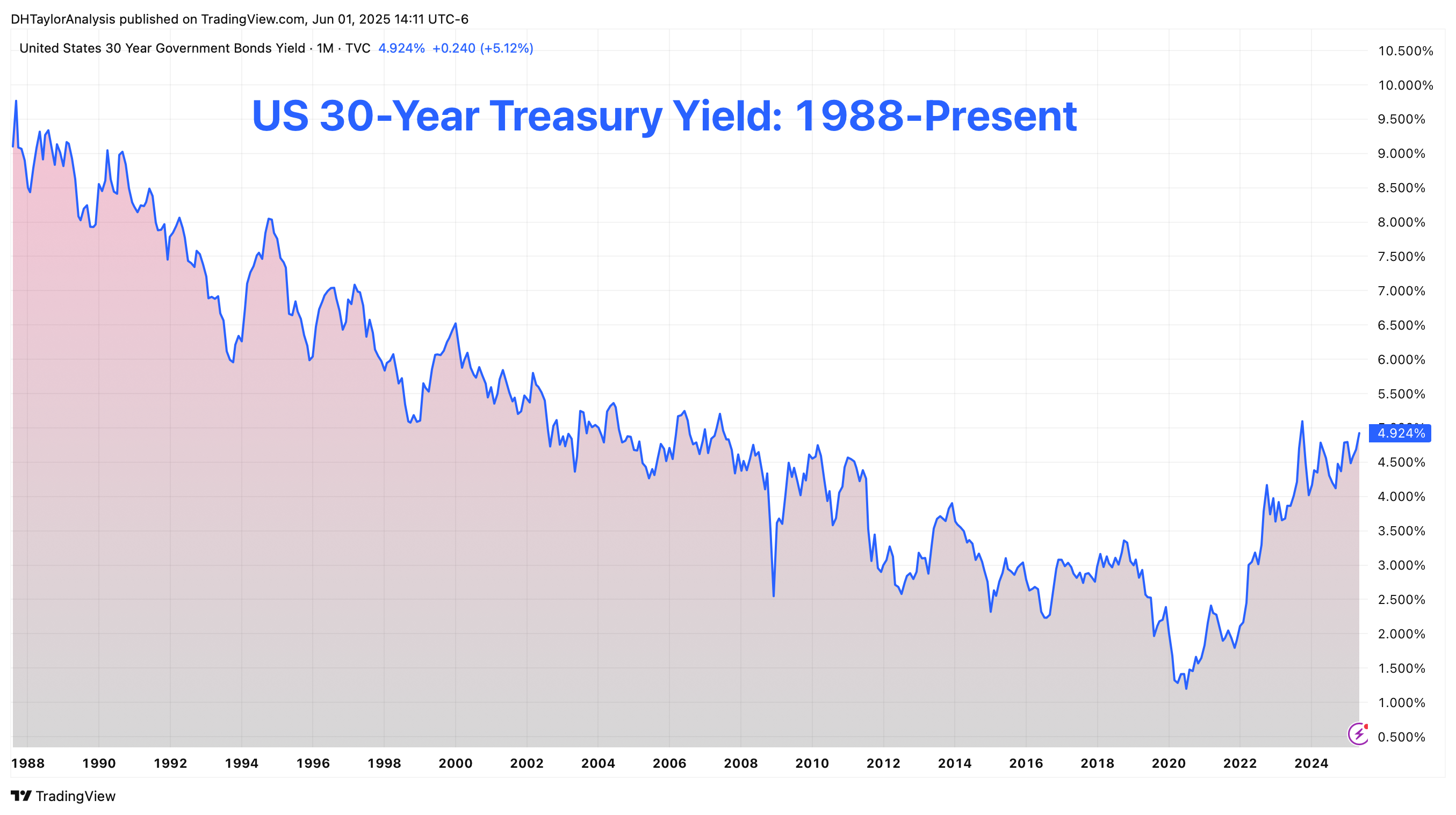 US Treasury yields continue to rise out of concerns about the US federal government’s fiscal policies. This will be costly to all Americans. Treasury yields are the starting basis for all loans in the United States. As they trend higher, consumer loan rates will follow.